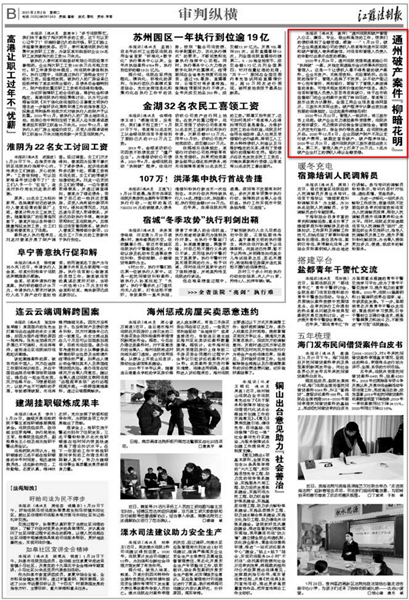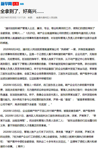 江蘇法制報截圖 近日“南通瑞東會計師事務(wù)所”的名字,不斷出現(xiàn)在《新華網(wǎng)》《江蘇法制報》的報道之中。一個小會所名字出現(xiàn)到主流新聞媒體中,實屬罕見。這要從我所承辦的一起破產(chǎn)案件說起。 2020年8月24日,通州區(qū)人民法院受理南通某瑞公司“執(zhí)轉(zhuǎn)破”一案,并指定南通瑞東會計師事務(wù)所擔(dān)任管理人。這是一個典型的企業(yè)無資產(chǎn)、無賬冊資料、無經(jīng)營場所的三無企業(yè),債權(quán)人看不到任何受償希望的破產(chǎn)案件。 南通瑞東會計師事務(wù)所由多名專業(yè)人員組成的清算組,主任會計師吳林海親自帶隊。在承辦法院的指導(dǎo)下,管理人從不動產(chǎn)登記中心到車管所,再到銀行,四處奔波,全方位開展資產(chǎn)調(diào)查工作,可惜仍未能發(fā)現(xiàn)有價值的財產(chǎn)信息。管理人團(tuán)隊苦苦尋思突破口,仔細(xì)尋找蛛絲馬跡,終于在稅務(wù)局申報表和市場監(jiān)督部門的企業(yè)檔案中發(fā)現(xiàn)了有益線索。原來債務(wù)人公司季某等三股東出資為認(rèn)繳制,全國工商企業(yè)信息查詢網(wǎng)顯示,三股東均未實際出資。根據(jù)企業(yè)進(jìn)入破產(chǎn)程序股東認(rèn)繳出資加速到期的法律規(guī)定,讓這起案件柳暗花明! 2020年10月22日,管理人一紙訴狀,將三股東告上法庭在申請訴訟保全后,債務(wù)人企業(yè)無力提供訴訟保全保證保險金的情況下管理人毅然決然決定有管理人機(jī)構(gòu)自己先行墊付,申請法院進(jìn)行了保全保全。終于,身兼企業(yè)法定代表人、股東的季某出面了,但未發(fā)現(xiàn)他有履行能力。另外兩名不參與公司經(jīng)營的股東湯某、尹某一臉“委屈”:“都是季某惹的禍,公司不破產(chǎn),再多的錢砸下去都是‘無底洞’。但是法律是公正的,2020年12月21日,通州區(qū)人民法院判決三股東必須承擔(dān)出資義務(wù)。管理人負(fù)責(zé)人告知被告“股東出資是你們應(yīng)當(dāng)履行的義務(wù),拿不到錢的債權(quán)人才是真正的受害者。”迫于法律的威力,2020年12月22日,“想通了”的湯某、尹某向管理人賬戶打來了20萬元,最終, 7名打工人員全額拿回血汗錢! “破產(chǎn)管理人專業(yè)、敬業(yè)和高效的工作,使我們的債權(quán)得到了全額受償,好高興……”1月29日,破產(chǎn)企業(yè)南通某瑞公司的債權(quán)人楊某等向管理人南通瑞東會計師事務(wù)所寄來感謝信,對管理人的辛勤付出表示由衷的感謝。 為債權(quán)人楊某代理執(zhí)行的律師感嘆:“破產(chǎn)案件中債權(quán)全額受償,我執(zhí)業(yè)二十多年來從沒見過。” 盡職、盡力、盡心、盡我所能,維護(hù)債權(quán)人的利益、維護(hù)法律的權(quán)威這是南通瑞東會計師事務(wù)所作為破產(chǎn)管理人一貫堅持的基本原則。所承辦案件得到債權(quán)人的認(rèn)可,得到法院的肯定,這是管理人的最大榮譽。 |